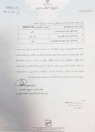 به گزارش وبدای دانشگاه علوم بهزیستی و توانبخشی، معاونت تدوین و ترویج استاندارد و رییس هیات فنی کمیته ملی استاندارد های ایزو در احکام جداگانه "دکتر امیرمسعود عرب، مهندس رضااسکویی زاده و دکتر حمیدرضا مختاری نیا " را به ترتیب به عنوان رییس، نایب رییس و دبیر کمیته مذکور معرفی کردند.