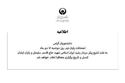اخبار > تمامی امتحانات روز دوشنبه (16 دی ماه) دانشجویان دانشگاه لغو ، و تاریخ جایگزین متعاقبا اعلام خواهد شد