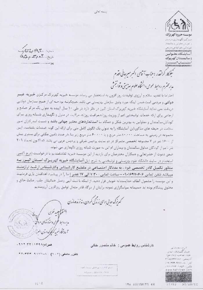 اخبار > آسایشگاه خیریه کهریزک استان البرز، " مددکار اجتماعی " استخدام می کند